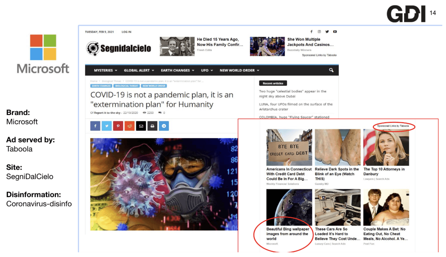 ‘The Great Reset’ is a prolific disinforming narrative that emerged from the pandemic with roots in anti-semitism and conspiratorial claims of a new world order controlled by global elites. Specifically, the Great Reset claims that COVID-19 and/or the vaccine was purposefully introduced as a population control plan implemented to help the global elite consolidate their power. GDI has found examples of monetised articles that promote this theory and weaken trust in scientific fact.
